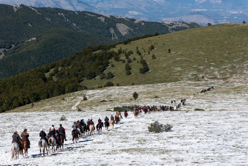 L’aria gelida ha reso l’avventura ancora più emozionante: salendo di quota, la fatica si è trasformata in stupore di fronte agli splendidi panorami. I cavalli Antonella e Guinness hanno affrontato con sicurezza e calma i percorsi più ripidi, storicamente utilizzati dai pastori durante la transumanza, dimostrando ottimo allenamento ed esperienza.